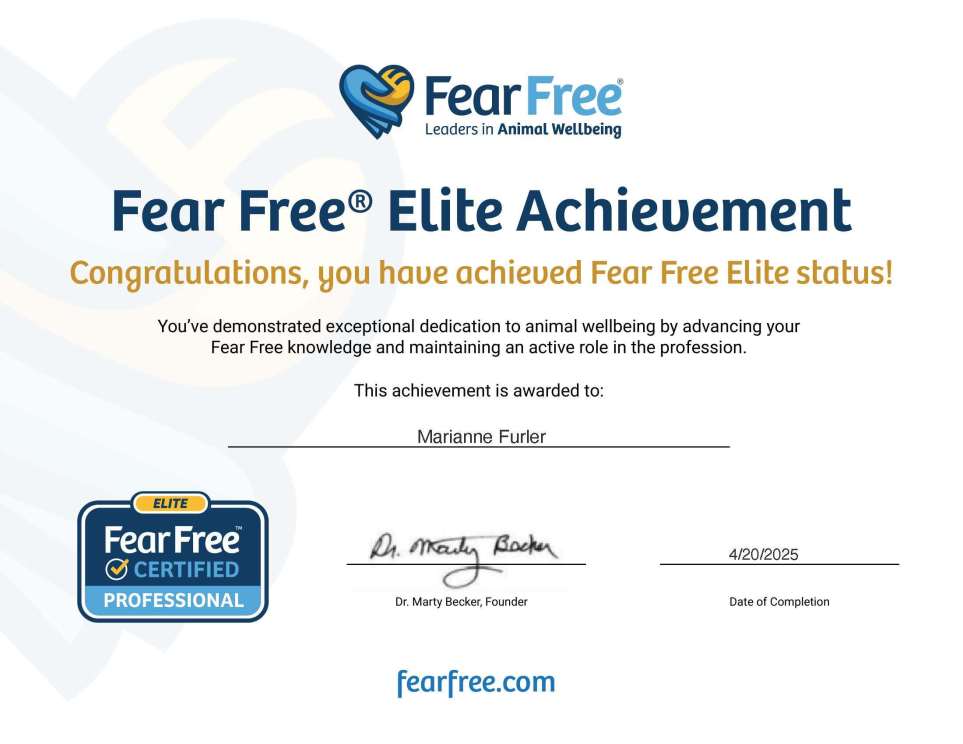 Meine weiteren Fachgebiete sind stressarmes Handling nach Fearfree und Tierphysiotherapie SVTPT.